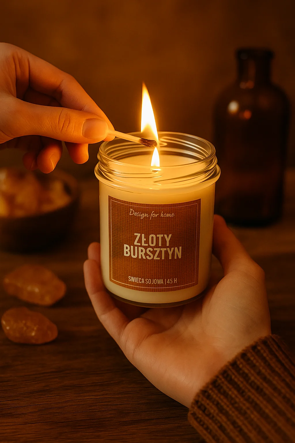 ZŁOTY BURSZTYN – świeca, która łączy w sobie głębię orientu z otulającym ciepłem. Zapach drzewa sandałowego miesza się z aksamitną wanilią, tworząc wyjątkową, szlachetną kompozycję idealną na spokojne wieczory i momenty odprężenia.